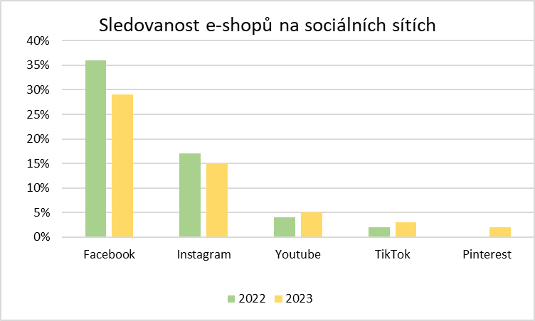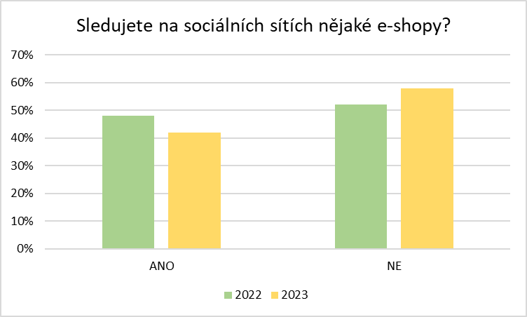 Dle výzkumu E-commerce study 2023, který agentura Res Solution učinila pro společný projekt Asociace pro elektronickou komerci (APEK) a agentury Nielsen, sledovala některý z e-shopů na sociálních sítích v roce 2023 téměř polovina dotazovaných, konkrétně 42%.