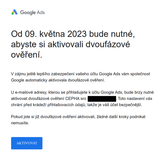 Váš účet v Google Ads obsahuje nesmírně citlivé údaje o vás, vaší reklamní kampani a v neposlední řadě také vaše platební údaje. Zajištěte si naprosté bezpečí aktivací dvoufázového ověření. Dvoufázové ověření zabere vždy několik vteřin, ale ochranu vašich údajů poskytuje velmi výraznou. Proto s jeho aktivací neotálejte příliš dlouho. Jak aktivaci provést se dozvíte v článku Zapnutí dvoufázové ověření.