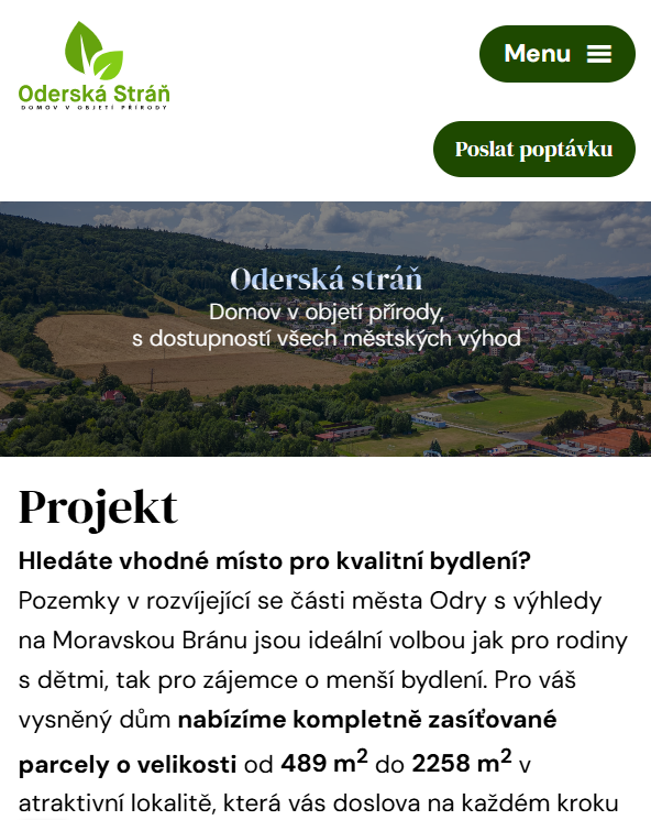 Hledáte vhodné místo pro kvalitní bydlení? Pozemky v rozvíjející se části města Odry s výhledy na Moravskou Bránu jsou ideální volbou jak pro rodiny s dětmi, tak pro zájemce o menší bydlení. Pro váš vysněný dům nabízíme kompletně zasíťované parcely o velikosti od 489 m2 do 2258 m2 v atraktivní lokalitě, která vás doslova na každém kroku obklopí zelení.